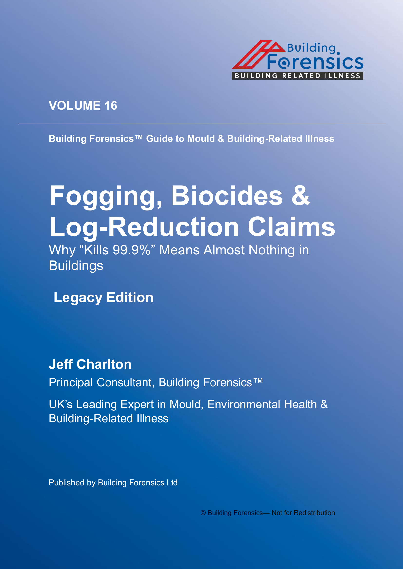 Vol 16 Fogging, Biocides & Log-Reduction Claims examines the environmental and health mechanisms discussed throughout this volume of the Global Microbial Building Related Investigation series. The book analyses contamination pathways, indoor exposure dynamics, and investigative challenges that often lead to misunderstanding or underestimation of mould and microbial hazards in residential and commercial buildings. Drawing on documented environmental cases, building science, and exposure evidence, the volume explores how hidden reservoirs, contaminated dust, ventilation pathways, and microbial by‑products can continue affecting occupants even after remediation attempts appear complete. Particular attention is given to diagnostic misinterpretation, environmental testing limitations, and procedural assumptions that prevent accurate identification of ongoing contamination. The discussion highlights why surface inspection alone rarely reflects the true environmental burden and why incomplete remediation strategies can allow hazards to persist or re‑emerge. Practical investigative principles are outlined for identifying contamination sources, interpreting environmental evidence, and understanding the broader health implications of building‑related exposure.