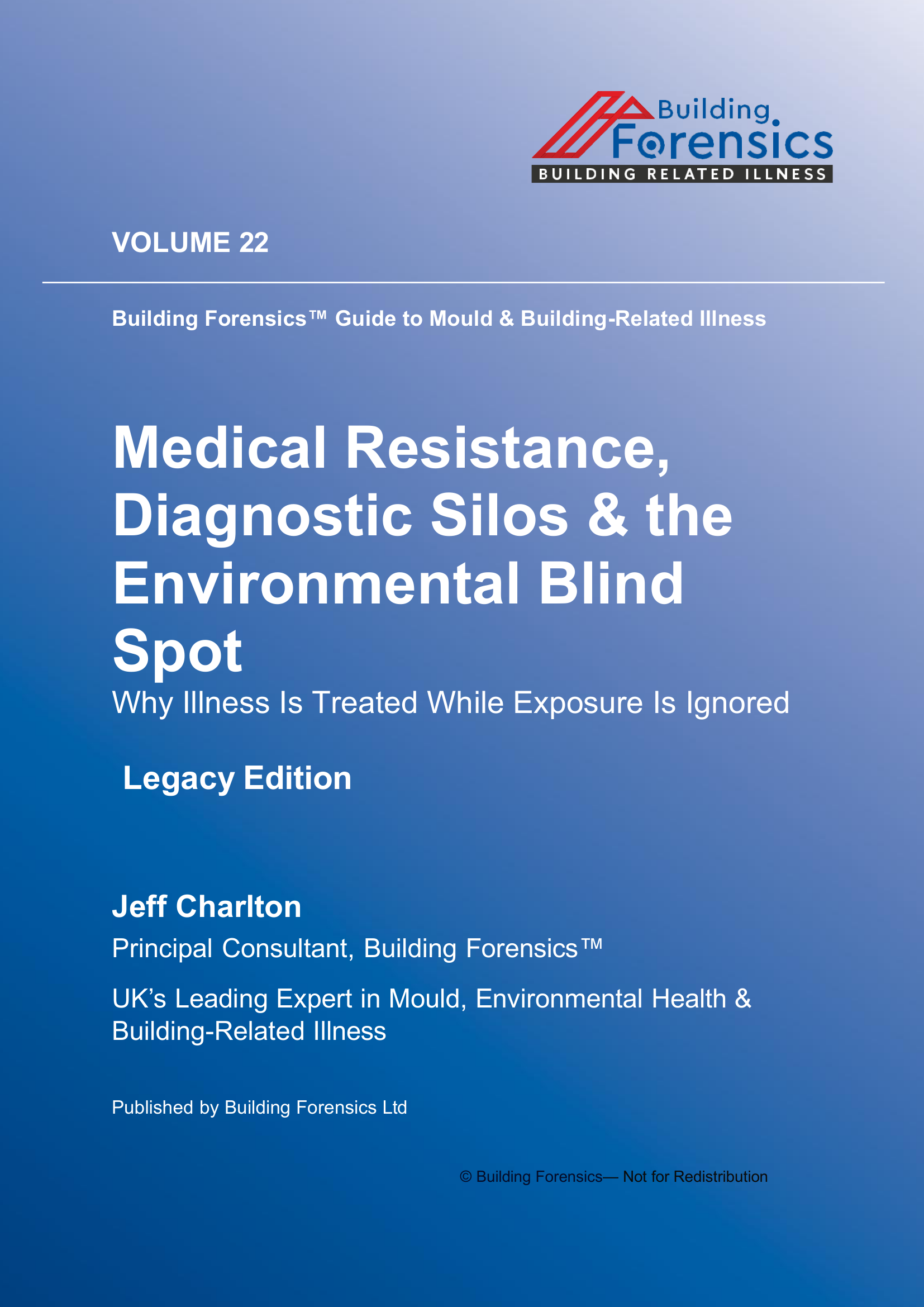 Vol 22 Medical Resistance, Diagnostic Silos & the Environmental Blind Spot examines the environmental and health mechanisms discussed throughout this volume of the Global Microbial Building Related Investigation series. The book analyses contamination pathways, indoor exposure dynamics, and investigative challenges that often lead to misunderstanding or underestimation of mould and microbial hazards in residential and commercial buildings. Drawing on documented environmental cases, building science, and exposure evidence, the volume explores how hidden reservoirs, contaminated dust, ventilation pathways, and microbial by‑products can continue affecting occupants even after remediation attempts appear complete. Particular attention is given to diagnostic misinterpretation, environmental testing limitations, and procedural assumptions that prevent accurate identification of ongoing contamination. The discussion highlights why surface inspection alone rarely reflects the true environmental burden and why incomplete remediation strategies can allow hazards to persist or re‑emerge. Practical investigative principles are outlined for identifying contamination sources, interpreting environmental evidence, and understanding the broader health implications of building‑related exposure.
