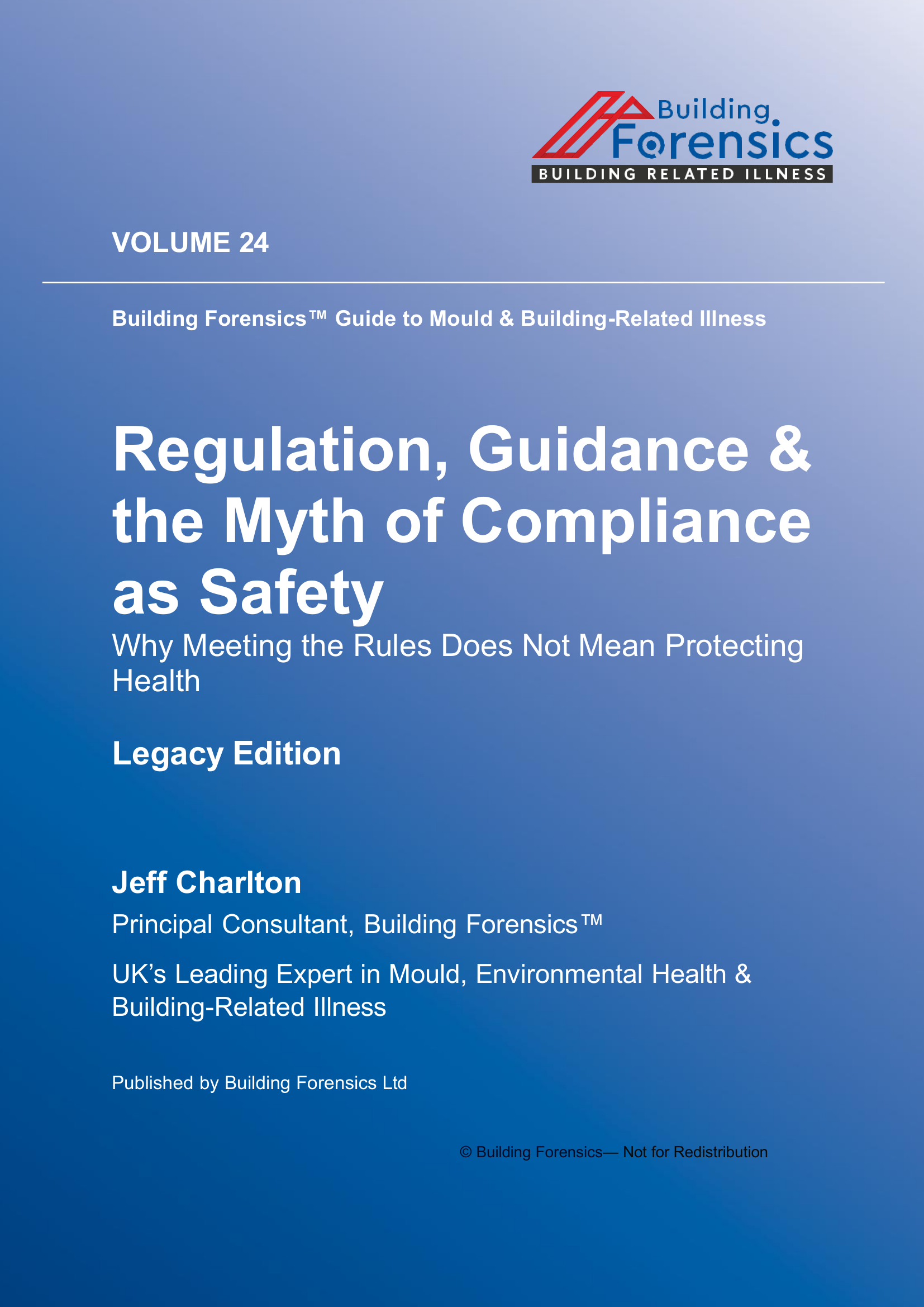 Vol 24 Regulation, Guidance & the Myth of Compliance as Safety examines the environmental and health mechanisms discussed throughout this volume of the Global Microbial Building Related Investigation series. The book analyses contamination pathways, indoor exposure dynamics, and investigative challenges that often lead to misunderstanding or underestimation of mould and microbial hazards in residential and commercial buildings. Drawing on documented environmental cases, building science, and exposure evidence, the volume explores how hidden reservoirs, contaminated dust, ventilation pathways, and microbial by‑products can continue affecting occupants even after remediation attempts appear complete. Particular attention is given to diagnostic misinterpretation, environmental testing limitations, and procedural assumptions that prevent accurate identification of ongoing contamination. The discussion highlights why surface inspection alone rarely reflects the true environmental burden and why incomplete remediation strategies can allow hazards to persist or re‑emerge. Practical investigative principles are outlined for identifying contamination sources, interpreting environmental evidence, and understanding the broader health implications of building‑related exposure.
