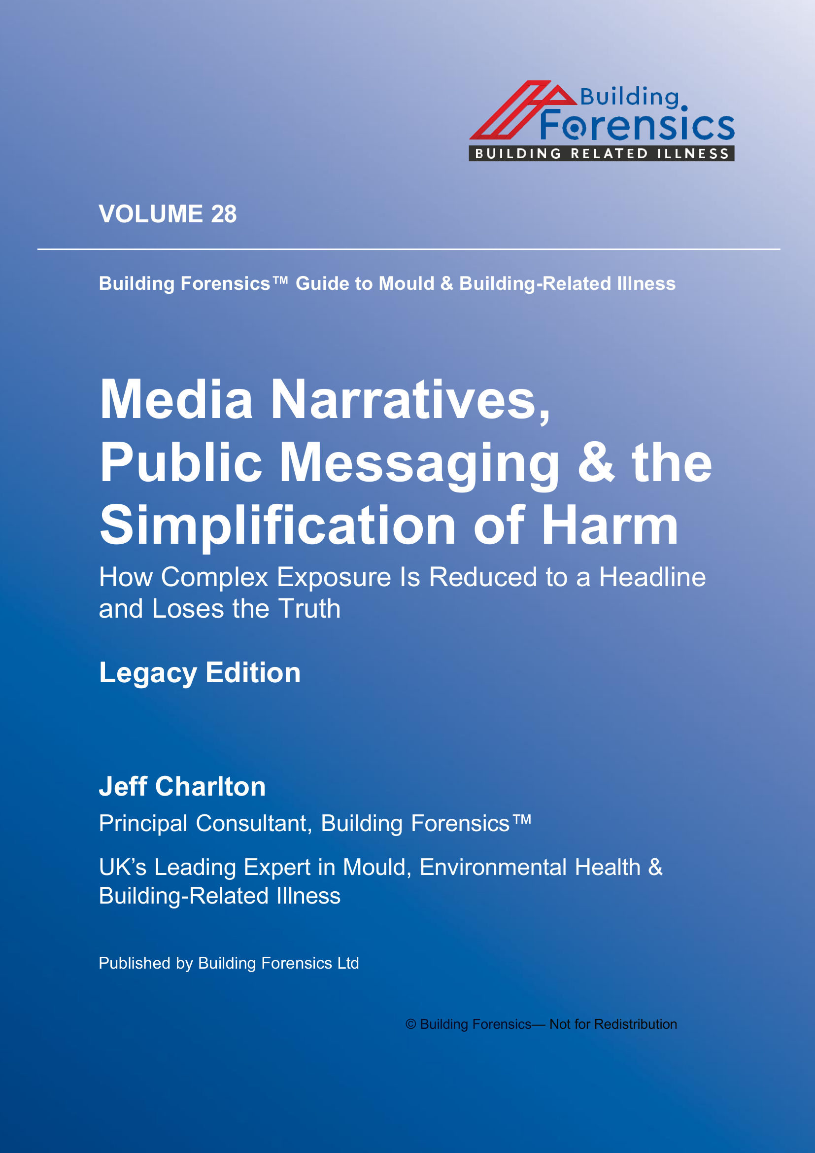 Vol 28 Media Narratives, Public Messaging & the Simplification of Harm examines the environmental and health mechanisms discussed throughout this volume of the Global Microbial Building Related Investigation series. The book analyses contamination pathways, indoor exposure dynamics, and investigative challenges that often lead to misunderstanding or underestimation of mould and microbial hazards in residential and commercial buildings. Drawing on documented environmental cases, building science, and exposure evidence, the volume explores how hidden reservoirs, contaminated dust, ventilation pathways, and microbial by‑products can continue affecting occupants even after remediation attempts appear complete. Particular attention is given to diagnostic misinterpretation, environmental testing limitations, and procedural assumptions that prevent accurate identification of ongoing contamination. The discussion highlights why surface inspection alone rarely reflects the true environmental burden and why incomplete remediation strategies can allow hazards to persist or re‑emerge. Practical investigative principles are outlined for identifying contamination sources, interpreting environmental evidence, and understanding the broader health implications of building‑related exposure.